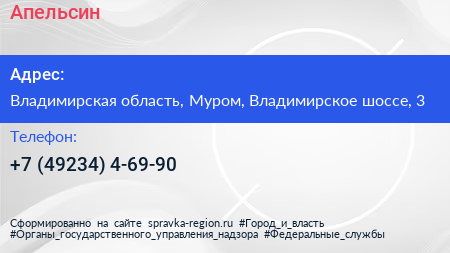 Апельсин по адресу Владимирская область, Муром, Владимирское шоссе, 3 в дальнейшем Организация, размещена в следующих категориях: