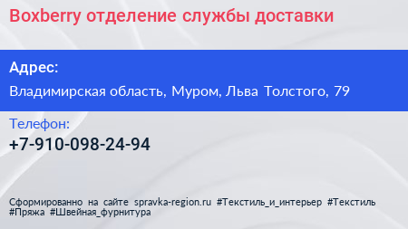 Boxberry, отделение службы доставки по адресу Владимирская область, Муром, Льва Толстого, 79 в дальнейшем Организация, размещена в следующих категориях:
