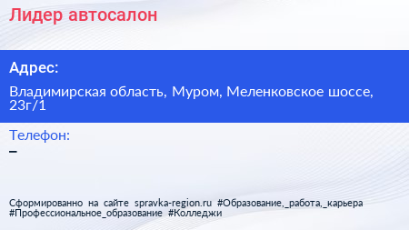 Лидер, автосалон по адресу Владимирская область, Муром, Меленковское шоссе, 23г/1 в дальнейшем Организация, размещена в следующих категориях: