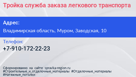 Тройка, служба заказа легкового транспорта по адресу Владимирская область, Муром, Заводская, 10 в дальнейшем Организация, размещена в следующих категориях: