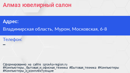 Алмаз, ювелирный салон по адресу Владимирская область, Муром, Московская, 6-8 в дальнейшем Организация, размещена в следующих категориях: