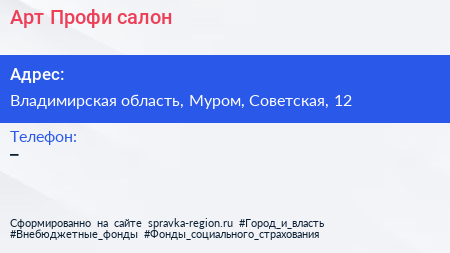 Арт-Профи, салон по адресу Владимирская область, Муром, Советская, 12 в дальнейшем Организация, размещена в следующих категориях:
