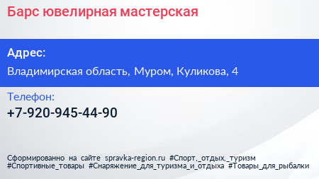 Барс, ювелирная мастерская по адресу Владимирская область, Муром, Куликова, 4 в дальнейшем Организация, размещена в следующих категориях: