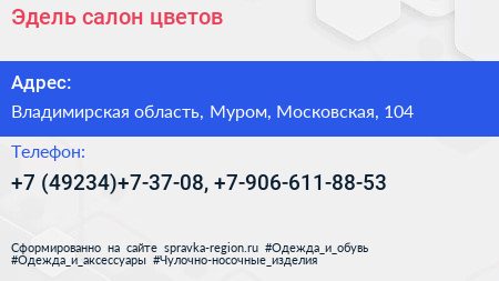 Эдель, салон цветов по адресу Владимирская область, Муром, Московская, 104 в дальнейшем Организация, размещена в следующих категориях: