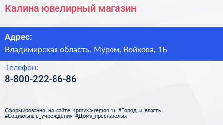 Калина, ювелирный магазин по адресу Владимирская область, Муром, Войкова, 1Б в дальнейшем Организация, размещена в следующих категориях: