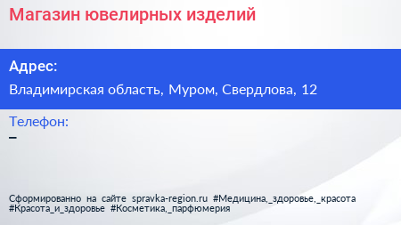 Магазин ювелирных изделий по адресу Владимирская область, Муром, Свердлова, 12 в дальнейшем Организация, размещена в следующих категориях: