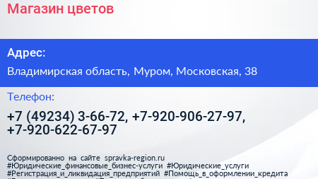 Магазин цветов по адресу Владимирская область, Муром, Московская, 38 в дальнейшем Организация, размещена в следующих категориях: