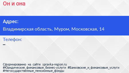 Он и она по адресу Владимирская область, Муром, Московская, 14 в дальнейшем Организация, размещена в следующих категориях: