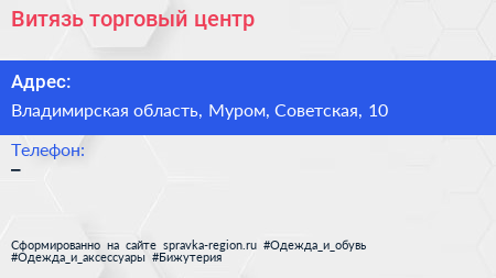 Витязь, торговый центр по адресу Владимирская область, Муром, Советская, 10 в дальнейшем Организация, размещена в следующих категориях: