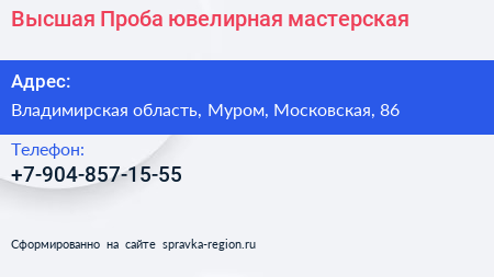 Высшая Проба, ювелирная мастерская по адресу Владимирская область, Муром, Московская, 86 в дальнейшем Организация, размещена в следующих категориях: