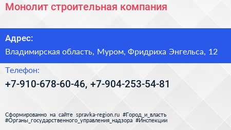 Монолит, строительная компания по адресу Владимирская область, Муром, Фридриха Энгельса, 12 в дальнейшем Организация, размещена в следующих категориях: