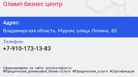 Олимп, бизнес-центр по адресу Владимирская область, Муром, улица Ленина, 82 в дальнейшем Организация, размещена в следующих категориях: