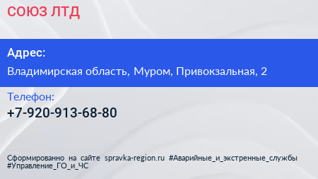 СОЮЗ ЛТД по адресу Владимирская область, Муром, Привокзальная, 2 в дальнейшем Организация, размещена в следующих категориях: