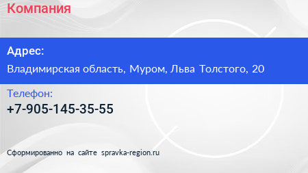 Компания по адресу Владимирская область, Муром, Льва Толстого, 20 в дальнейшем Организация, размещена в следующих категориях: