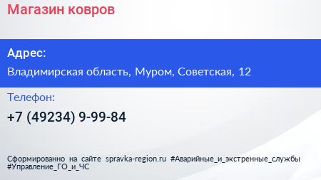 Магазин ковров по адресу Владимирская область, Муром, Советская, 12 в дальнейшем Организация, размещена в следующих категориях: