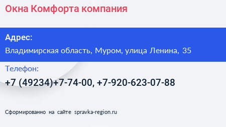 Окна Комфорта, компания по адресу Владимирская область, Муром, улица Ленина, 35 в дальнейшем Организация, размещена в следующих категориях: