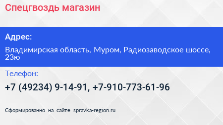 Спецгвоздь, магазин по адресу Владимирская область, Муром, Радиозаводское шоссе, 23ю в дальнейшем Организация, размещена в следующих категориях: