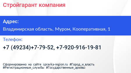 Стройгарант, компания по адресу Владимирская область, Муром, Кооперативная, 1 в дальнейшем Организация, размещена в следующих категориях: