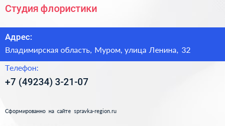 Студия флористики по адресу Владимирская область, Муром, улица Ленина, 32 в дальнейшем Организация, размещена в следующих категориях: