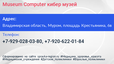 Museum Computer, кибер-музей по адресу Владимирская область, Муром, площадь Крестьянина, 6в в дальнейшем Организация, размещена в следующих категориях: