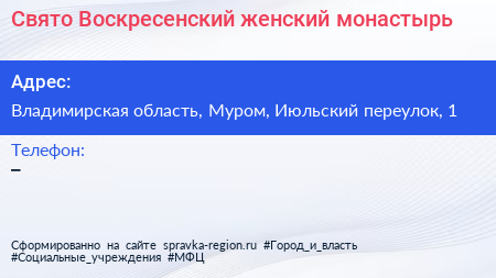 Свято-Воскресенский женский монастырь по адресу Владимирская область, Муром, Июльский переулок, 1 в дальнейшем Организация, размещена в следующих категориях:
