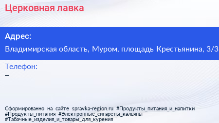 Церковная лавка по адресу Владимирская область, Муром, площадь Крестьянина, 3/3 в дальнейшем Организация, размещена в следующих категориях: