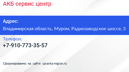 АКБ, сервис-центр по адресу Владимирская область, Муром, Радиозаводское шоссе, 3 в дальнейшем Организация, размещена в следующих категориях: