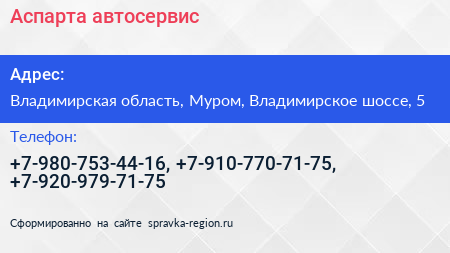 Аспарта, автосервис по адресу Владимирская область, Муром, Владимирское шоссе, 5 в дальнейшем Организация, размещена в следующих категориях: