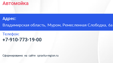 Автомойка по адресу Владимирская область, Муром, Ремесленная Слободка, 6а в дальнейшем Организация, размещена в следующих категориях: