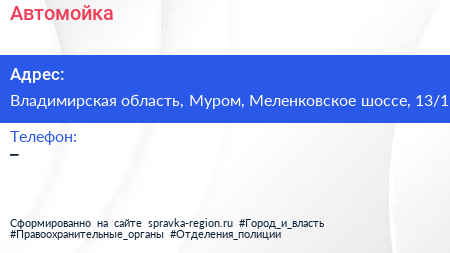 Автомойка по адресу Владимирская область, Муром, Меленковское шоссе, 13/1 в дальнейшем Организация, размещена в следующих категориях: