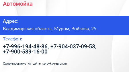 Автомойка по адресу Владимирская область, Муром, Войкова, 25 в дальнейшем Организация, размещена в следующих категориях: