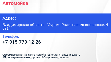 Автомойка по адресу Владимирская область, Муром, Радиозаводское шоссе, 4 ст1 в дальнейшем Организация, размещена в следующих категориях: