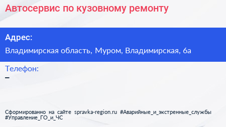 Автосервис по кузовному ремонту по адресу Владимирская область, Муром, Владимирская, 6а в дальнейшем Организация, размещена в следующих категориях: