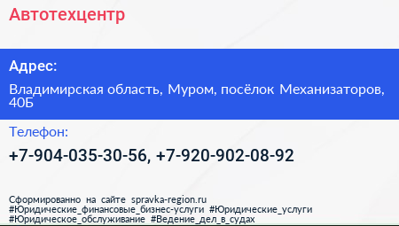 Автотехцентр по адресу Владимирская область, Муром, посёлок Механизаторов, 40Б в дальнейшем Организация, размещена в следующих категориях: