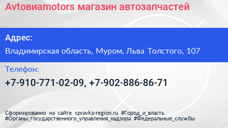 Avtoвиаmotors, магазин автозапчастей по адресу Владимирская область, Муром, Льва Толстого, 107 в дальнейшем Организация, размещена в следующих категориях: