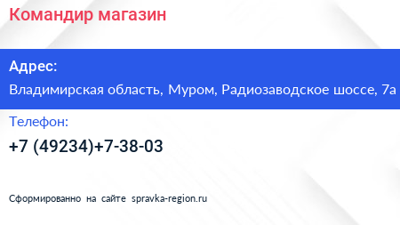 Командир, магазин по адресу Владимирская область, Муром, Радиозаводское шоссе, 7а в дальнейшем Организация, размещена в следующих категориях: