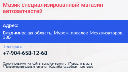 Мазик, специализированный магазин автозапчастей по адресу Владимирская область, Муром, посёлок Механизаторов, 38Б в дальнейшем Организация, размещена в следующих категориях: