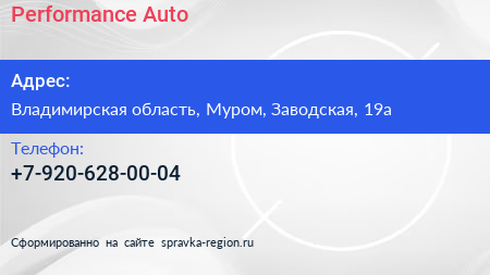 Performance Auto по адресу Владимирская область, Муром, Заводская, 19а в дальнейшем Организация, размещена в следующих категориях: