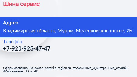 Шина-сервис по адресу Владимирская область, Муром, Меленковское шоссе, 2Б в дальнейшем Организация, размещена в следующих категориях: