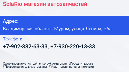 SolaRio, магазин автозапчастей по адресу Владимирская область, Муром, улица Ленина, 55а в дальнейшем Организация, размещена в следующих категориях: