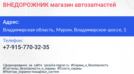 ВНЕДОРОЖНИК, магазин автозапчастей по адресу Владимирская область, Муром, Владимирское шоссе, 1 в дальнейшем Организация, размещена в следующих категориях: