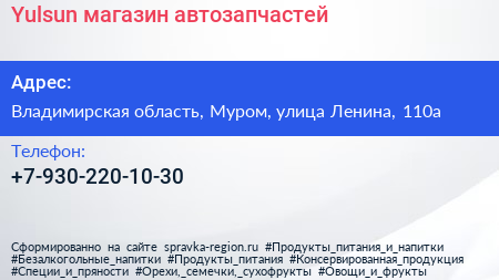 Yulsun, магазин автозапчастей по адресу Владимирская область, Муром, улица Ленина, 110а в дальнейшем Организация, размещена в следующих категориях: