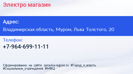Электро, магазин по адресу Владимирская область, Муром, Льва Толстого, 20 в дальнейшем Организация, размещена в следующих категориях: