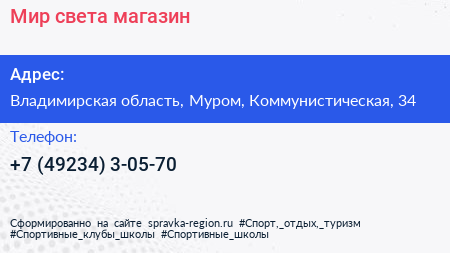 Мир света, магазин по адресу Владимирская область, Муром, Коммунистическая, 34 в дальнейшем Организация, размещена в следующих категориях: