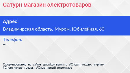 Сатурн, магазин электротоваров по адресу Владимирская область, Муром, Юбилейная, 60 в дальнейшем Организация, размещена в следующих категориях: