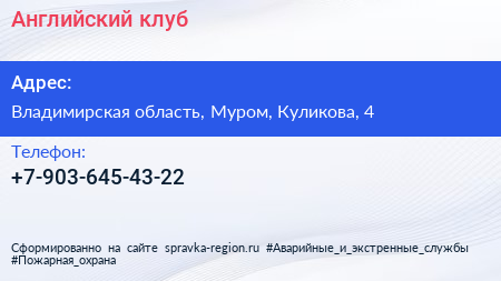 Английский клуб по адресу Владимирская область, Муром, Куликова, 4 в дальнейшем Организация, размещена в следующих категориях: