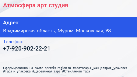 Атмосфера, арт-студия по адресу Владимирская область, Муром, Московская, 98 в дальнейшем Организация, размещена в следующих категориях: