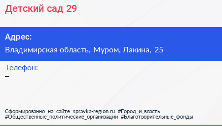 Детский сад №29 по адресу Владимирская область, Муром, Лакина, 25 в дальнейшем Организация, размещена в следующих категориях: