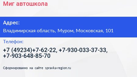 Миг, автошкола по адресу Владимирская область, Муром, Московская, 101 в дальнейшем Организация, размещена в следующих категориях:
