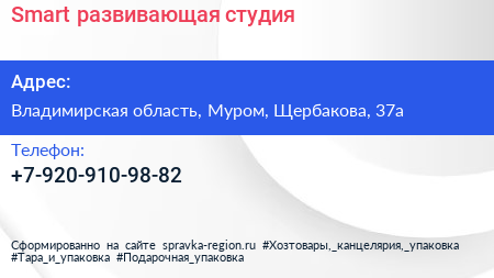 Smart, развивающая студия по адресу Владимирская область, Муром, Щербакова, 37а в дальнейшем Организация, размещена в следующих категориях:
